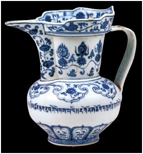 明宣德時(shí)期(公元1426年--1435年)贈(zèng)送的青花纏枝蓮紋僧帽壺,高23cm,底徑9cm。該壺是仿藏傳佛教僧人的僧帽所制,故稱“僧帽壺”。壺的通體飾青花紋樣,腹部書寫一圈藏文,意為“晝吉祥、夜吉祥、正午吉祥、晝夜吉祥、三寶吉祥”。但這圈銘文中的藏文字母和分隔符號(hào)書寫有誤,可見這是不通藏文的漢族工匠仿書。足墻飾美麗的卷草紋,器底青花雙圈書寫兩行六字“大明宣德年制”。宣德青花瓷以其古樸典雅的造型,晶瑩艷麗的釉色,多姿多彩的紋飾聞名于世。宣德時(shí)期西藏與內(nèi)地往來(lái)綿密,大量的青花瓷做為皇帝贈(zèng)品傳入西藏。西藏上層為保存這些瓷器不致受損,還用金屬或皮革制成瓷套盛裝。此件瓷壺從造型到紋飾,多含西藏元素,顯然它是朝廷命景德鎮(zhèn)官窯專門燒制贈(zèng)予西藏上層的。