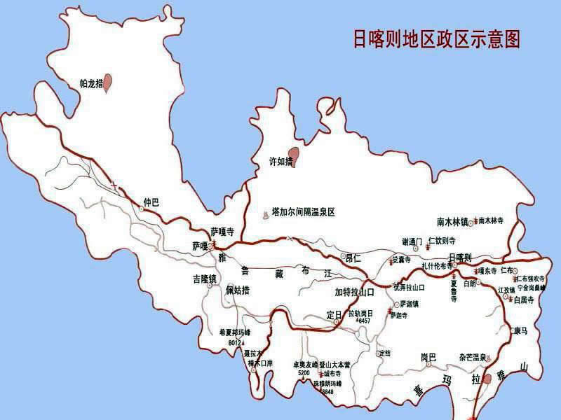 吉隆縣 面積9300平方千米,人口17536,政府駐宗嘎鎮(zhèn),下轄2個(gè)鎮(zhèn)、4個(gè)鄉(xiāng)