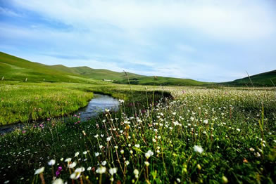 草甸、鮮花、小溪、藍天、白云、羊群,構(gòu)成了一幅優(yōu)美迷人的圖畫。