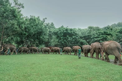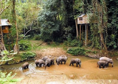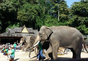 游客到野象谷,白天可觀賞訓練過的大象表演節(jié)目,夜晚可一睹從森林走到此地覓食的真正野象風姿。
