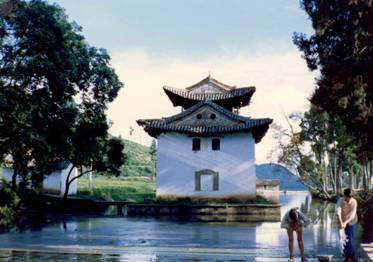 金蓮捧日舊八景稱“牢莊晚照”,系指澂江壩子?xùn)|部,舊城旁邊的金蓮山。這座山,古稱牢莊山或龜山,此山高圓平整,眾山環(huán)拱。當(dāng)夕陽西墜,惟此山紅光映照,燦若星辰,又因山上遍長野金蓮花,與夕照相輝映,猶似金蓮捧日而得名。
