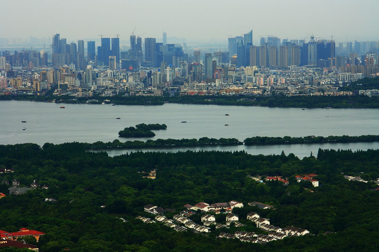 杭州市有著江、河、湖、山交融的自然環(huán)境。全市丘陵山地占總面積的65.6%,平原占26.4%,江、河、湖、水庫(kù)占8%,世界上最長(zhǎng)的人工運(yùn)河—京杭大運(yùn)河和以大涌潮聞名的錢塘江穿過(guò)。