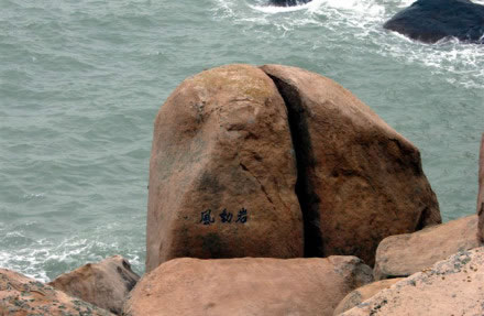 能以人力或風(fēng)力推動(dòng)而搖擺的大巖石,在各地勻有發(fā)現(xiàn)。南麂三盤(pán)尾石門(mén)旁的風(fēng)動(dòng)巖卻別有情趣。此石高約5.5米,直徑4米,形如銅鼓,卻裂成兩瓣,一瓣是“靜如處子”分外端莊;另一瓣,凡遇上5級(jí)以上大風(fēng),便自行搖動(dòng),可謂“動(dòng)似脫兔”,還以發(fā)出悅耳聲響,宛如海底傳來(lái)的進(jìn)軍號(hào)角。倘若無(wú)風(fēng)時(shí),那只得勞駕游客,憑力氣去推、去搖。面對(duì)風(fēng)動(dòng)巖了,聯(lián)想起佛教中關(guān)于“風(fēng)動(dòng)也,情動(dòng)也,見(jiàn)仁者自己心動(dòng)”的“因緣和合”典故,似乎明白了自然景觀中也充滿(mǎn)生活哲理。此巖其自身根基不穩(wěn),加上風(fēng)的外力,便顯得搖擺不定。