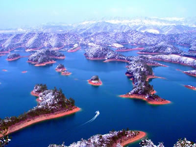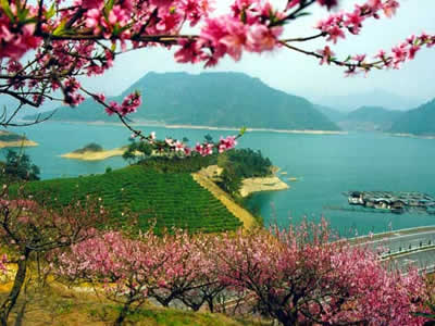 千島湖,是一個(gè)美麗的湖 。湖中那1078個(gè)島嶼,姿態(tài)各異,風(fēng)姿綽約。春游湖上,布滿山花的島嶼,是一個(gè)個(gè)天真爛漫的村姑;夏日游湖,人們多想在這碧波中逐浪暢游;秋山紅葉,使人想起"霜葉紅于二月花"的詩(shī)句,雪滿湖山,松挺山崖,又是一幅王維筆下的詩(shī)畫圖。