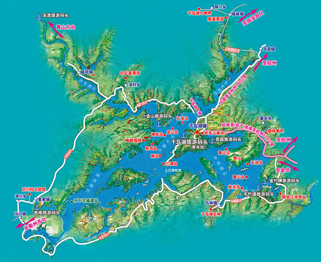 千島湖與桐廬瑤林仙境、嚴(yán)子陵釣臺(tái),建德大慈巖,蘭溪諸葛八卦村,龍游石窟,安徽西遞、宏村等景點(diǎn)聯(lián)成一體,體,吸引眾多的游客。千島湖所在的淳安縣北接臨安縣、南接常山縣、西南與開化縣、衢州市為鄰,東南與桐廬和建德二縣市接壤,西北與安徽省交界。