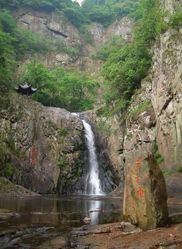 月籠輕紗第一洩:水流從石河瀉下,瀑布小巧平緩,柔美如月籠輕紗,雋永奇秀,“樂(lè)聲幽咽,萬(wàn)松颯然,隔岸秋花爛漫,禽聲甚樂(lè)”,瀑布中間有一水潭,直徑1.5米,口微向內(nèi)收,四壁光滑,深不見(jiàn)底,人稱(chēng)“小龍井”,俗呼小腳桶潭,是人工開(kāi)鑿還是天然形成,還是一個(gè)謎,古人贊其曰:龍井鑿石灘,園勻如截竹;登波落纖埃,照見(jiàn)須眉綠。