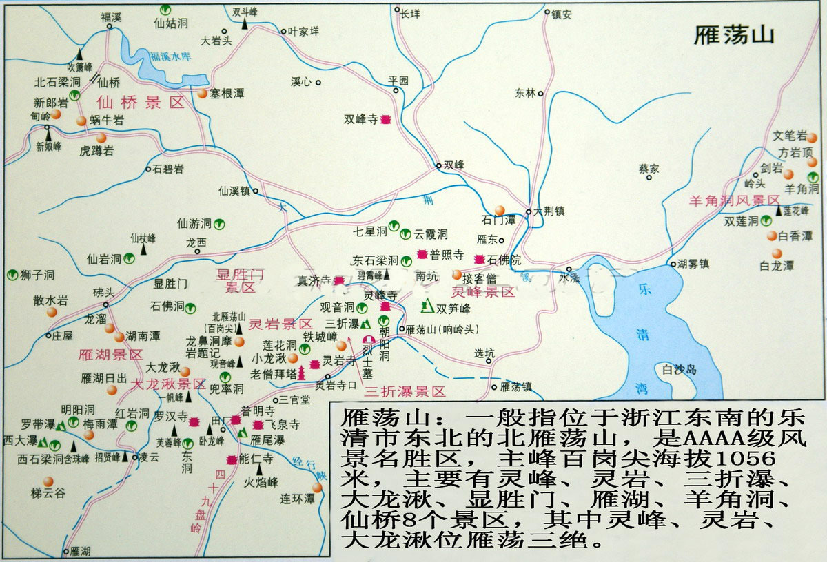 雁蕩山開發(fā)時間悠久,風景資源豐富,人文景觀也頗具特色。據(jù)舊志書記載,計有十八古剎、十院、十六亭、一百零二峰、四十六洞、六十一巖、八谷、十四嶂、十嶺、十三溪、十七潭、十三瀑、七門、一橋、二湖、六坑、四水、四泉、二十六石等門類,此外還有一些不入門類的景點未統(tǒng)計在內。根據(jù)地名普查所出的資料,與舊志書所載又略有不同,共計有景目五百五十多個。歷史上,人們根據(jù)山嶺走向把全山分為東外、東內、西外、西內四谷和南、北二閤六大景區(qū)。后來一方面因全山景區(qū)范圍的擴大,另一方面根據(jù)游人腳步和景目分布范圍劃分為八大景區(qū),分別以各景區(qū)內的主景點名稱命名為靈峰、靈巖、大龍湫、雁湖、顯勝門、仙橋和羊角洞景區(qū),其中大龍湫、雁湖、顯勝門、仙橋景區(qū)的的范圍與所屬舊名景區(qū)基本一樣,只有東內谷和東外谷的景區(qū)劃分發(fā)生了很大的變化。一是東內谷中分別以景點分布情況分設靈巖、三折瀑和靈峰三景區(qū);二是取消了東外谷景區(qū),將所屬范圍納入靈峰景區(qū);三是增設了羊角洞景區(qū),舊志書曾將區(qū)內的雙蓮洞納入東外谷,事實上雙蓮洞所在地距東外谷約二十里之遙,因此需獨立設一景區(qū)。