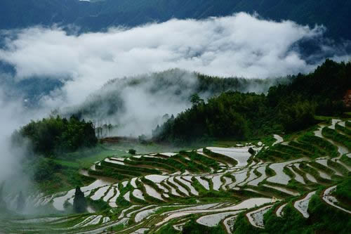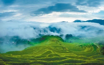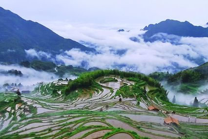 是梯田,是濕地,是澤國(guó),形成亦山亦水的奇觀,來(lái)源于森林腹地恒久的涵養(yǎng)補(bǔ)給,只見云水天來(lái),不見旱澇來(lái)襲。雨云象俏皮的村姑,出沒(méi)無(wú)定、行蹤無(wú)定,著裝無(wú)定,心情無(wú)定……忽而為項(xiàng)頸之哈達(dá),忽而為足下之地毯,忽而為纏腰之彩帶,親親云朵,感悟創(chuàng)意。這就是云和梯田——沉浮著的云水世界。