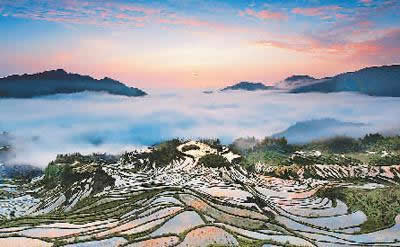 云和梯田如同一位四季美人:春穿花衫,水滿層疇:夏披綠紗,禾海滾浪;秋著紅裳,金穗漫山;冬裹銀裘,雪毯素裝。年復(fù)一年,山花不敗,鳴禽百囀,流泉不竭。日復(fù)一日,從山嵐染成金玫瑰,到白云變幻成蒼狗,一幕幕展現(xiàn)大自然造型和著色的奇詭。